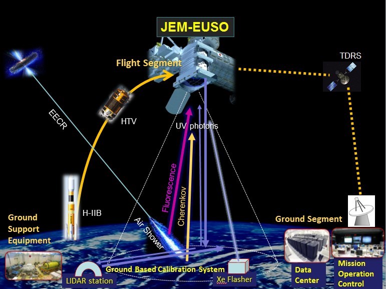 JEM-EUSO est un projet international de télescope à placer sur la Station Spatiale Internationale, regardant la terre à 400 km d’altitude avec une ouverture telle qu’un cercle de 500 km de diamètre est observé au moyen de la lumière UV émise par la fluorescence de l’azote de l’air excité par les gerbes induites par les rayons cosmiques d’énergie supérieur à 1020 eV.